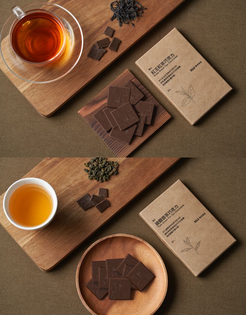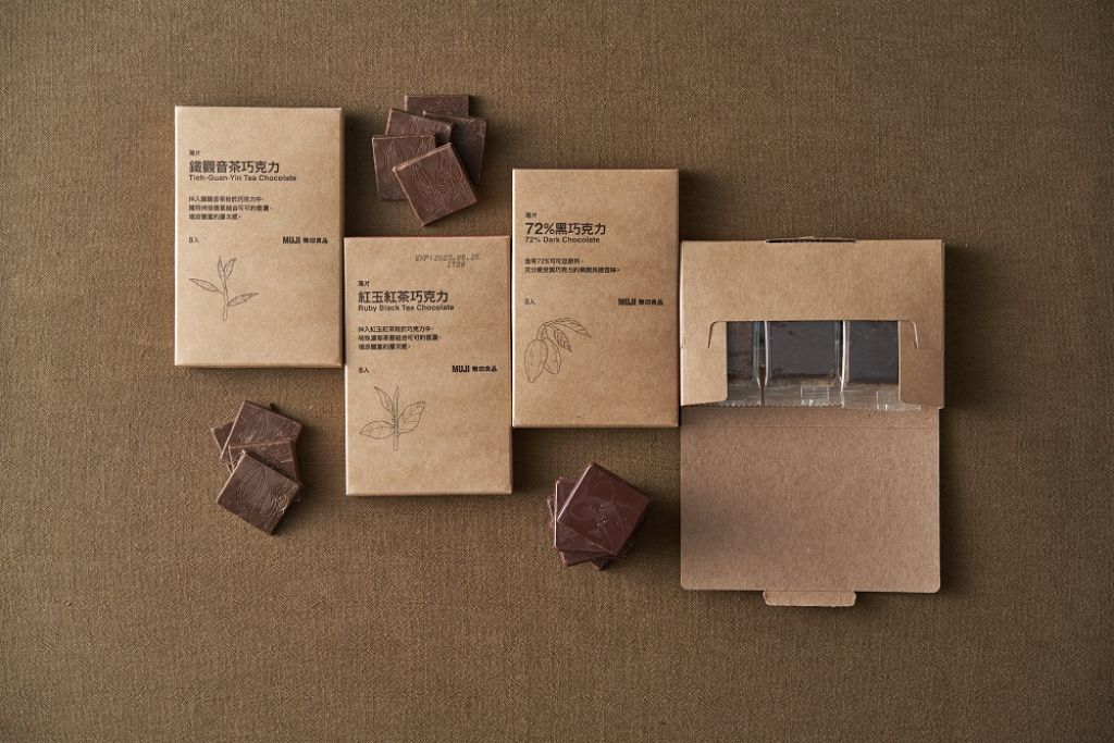 台灣茶葉頗具盛名,MUJI無印良品選用紅玉紅茶與鐵觀音,製作「茶口味巧克力系列」。使用54%調溫黑巧克力加上白巧克力,拌入紅玉紅茶粉及鐵觀音茶粉,除了品味茶葉的特殊香氣,也吃得到巧克力的香濃,獨特烤焙香氣,增添豐富的口感層次。
