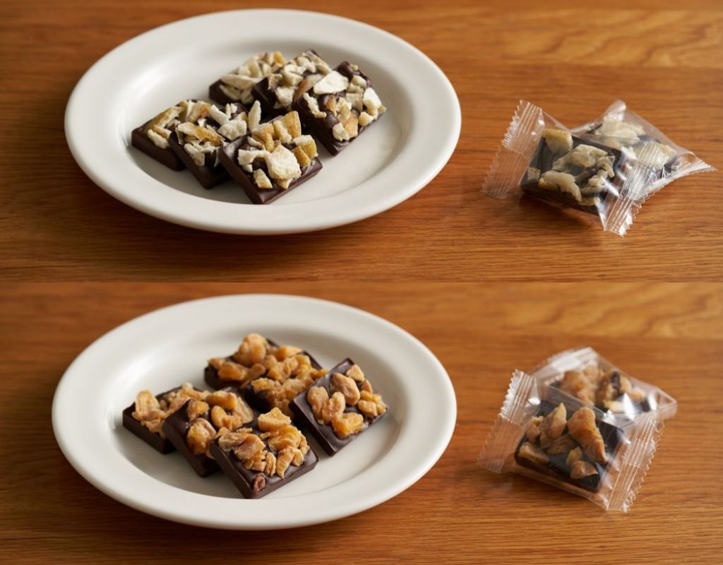 台灣有水果王國美稱,MUJI無印良品也開發「果乾巧克力系列」,以低溫烘製的水果乾搭配巧克力,推出文旦柚皮果乾巧克力與金鑽鳳梨果乾巧克力。MUJI無印良品以珍惜食材的心意將果皮再製加工,小塊果乾點綴於黑巧克力上,口感吃得到水果的纖維,也能品味巧克力的滑順,巧妙融合巧克力的甜味口感與酸香清甜的果乾口感。