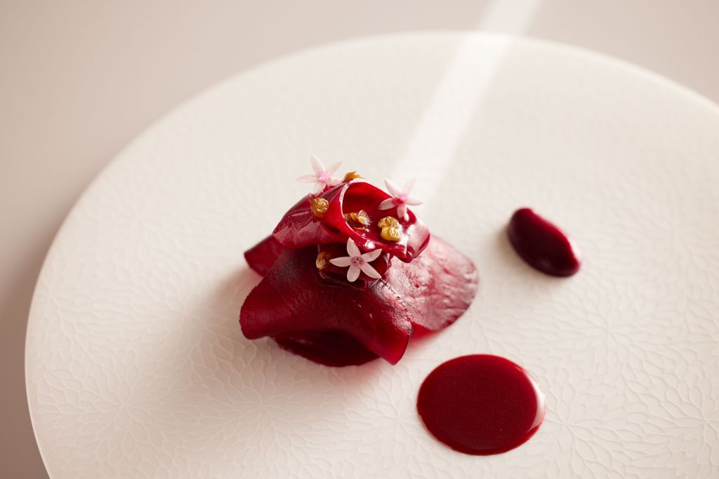 前菜「義式豬蹄香腸、鴨肝、甜菜根」(Zampone, Foie Gras, Beetroot)在義大利有迎接新年、帶來好運的寓意,主廚以鹽焗、醃漬甜菜根搭配義式豬蹄香腸與鴨肝,運用豬胸肋與覆盆子製作醬汁,平衡豐美的油脂香氣。