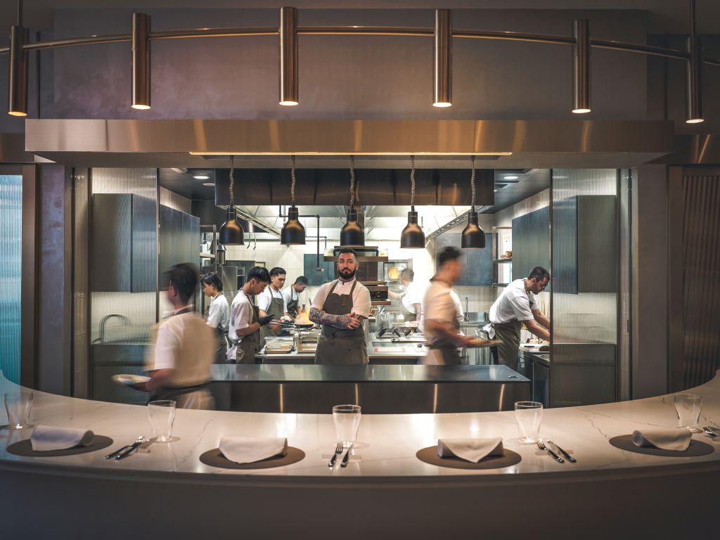 客席以圓弧吧台環繞開放式廚房,讓賓客近身感受料理現場。菜單設計採套餐型式提供9道菜式加附麵包,主廚融入義式飲食文化,開胃小點以豐富的Canapé、Grissini及義式手工麵包搭配自製發酵黑蒜奶油,拉開饗宴序曲。