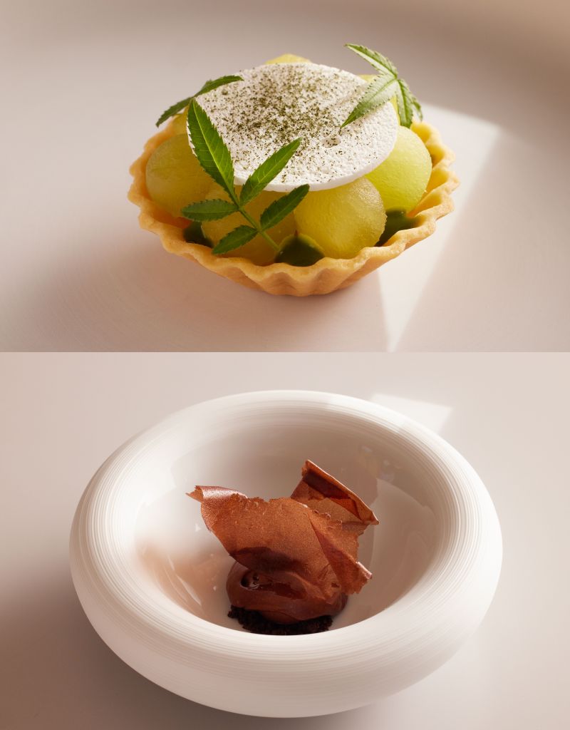 甜點「蘋果、玫瑰、肉豆蔻」(Apple, Rose, Nutmeg)使用乾燥玫瑰花瓣製作塔殼、肉豆蔻泡沫與糖漬青紅蘋果粒,搭配芳香萬壽菊洋溢清新爽口的氣息