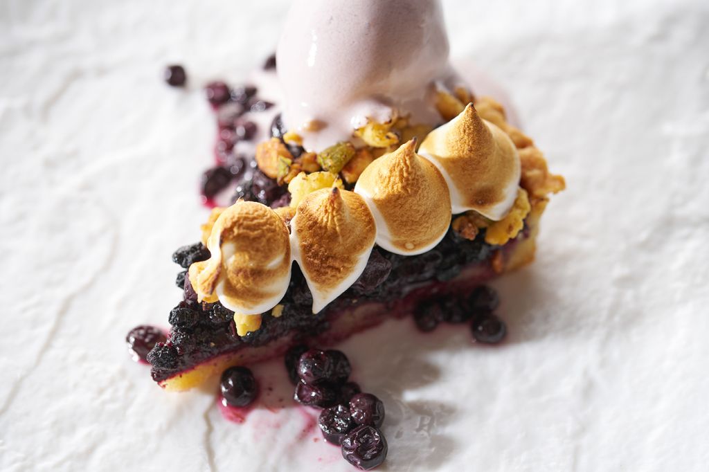 GMT義大利餐廳「義品楓宴」的甜點「藍莓派」,主廚使用加拿大產地直送的新鮮藍莓,與迷迭香與加拿大楓糖漿,一起混合加熱,再與塔皮結合,上方點綴沁涼的冰淇淋,飄散楓糖香氣,香甜不膩口。
