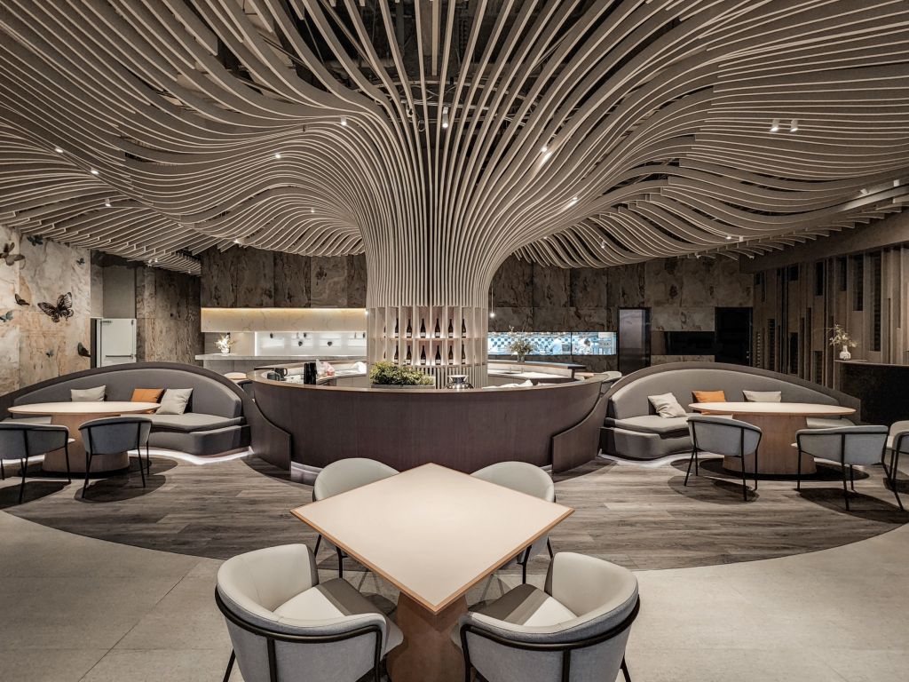 Papillon餐廳整體設計打造以”都市森林”為主軸,攜手光影大師賴雨農及金工藝術家陳郁璇,共同設計別出心裁的森林系法式餐廳,中央吧台區採用樹木造型,開枝散葉猶如一片樹林,枝柳結構包覆中島,讓空間充滿著自然氣息。