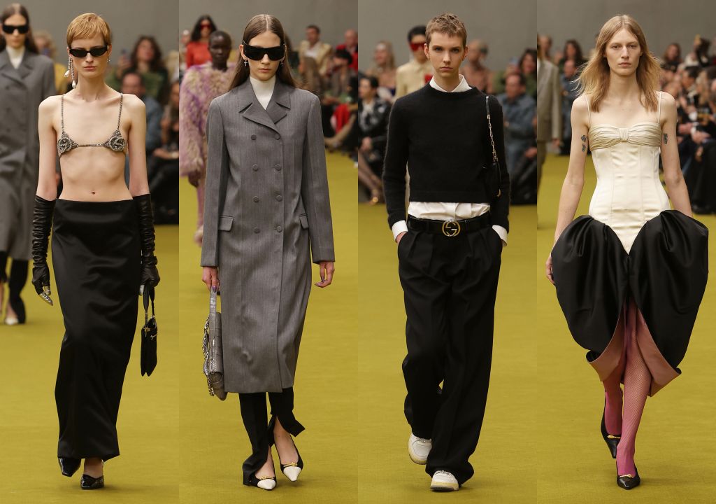 羊毛或皮革西裝剪裁出寬鬆的肩部、低領口與低腰褲,營造風格。裙子以長款或及膝款式亮相,採用透明面料與裝飾蕾絲,讓人聯想到性感內衣。鑲嵌水晶的GG金屬內衣襯托了垂墜在領口與胸部的誇張造型雞尾酒珠寶,戲劇性的延伸到地板。