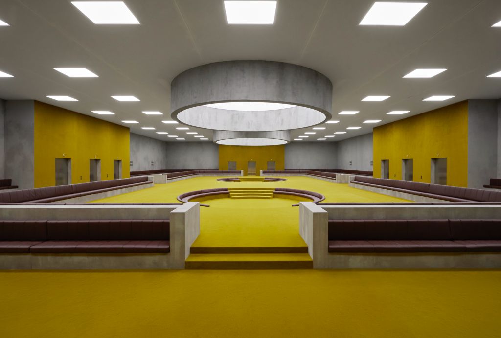 圓形舞台四周環繞著採用創新Demetra材質製成的座椅,代表GUCCI創意團隊核心的協作循環。一個模糊但熟悉的音場觸發了記憶,喚起千禧世代的時代感與時尚態度,這些時代感與時尚態度以當代美學形式具體化,映射本季女裝的復古奢華美學設計。