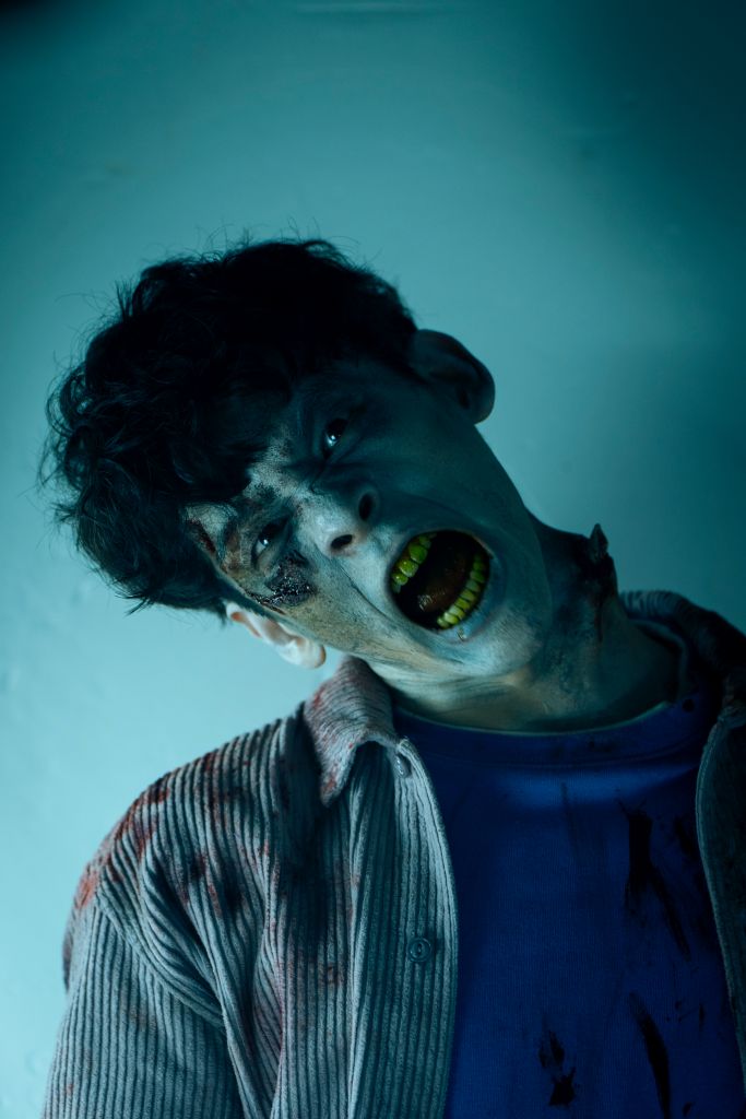 雖是喜劇題材,程偉豪依舊忍不住嚇唬觀眾,開場阿嬤在古宅進行冥婚儀式、毛毛在明翰家化身厲鬼等場景,讓影迷驚聲尖叫。最新花絮可見林柏宏的鬼妝扮相,整張臉慘綠爛掉、一口黃牙,脖子折斷頸椎骨頭直接外露超驚悚,完成特效妝容的柏宏對此相當滿意,還調皮的在現場展現「神出鬼沒」的功力嚇到工作人員。