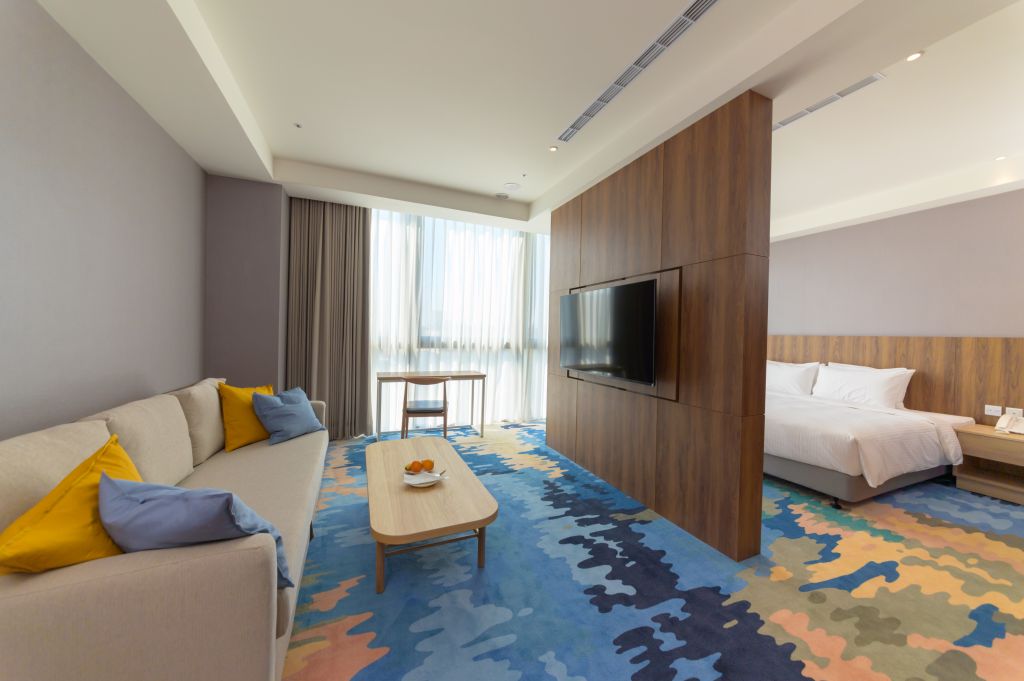 嶄新的金鬱金香客房時尚設計,配備英國頂級斯林百蘭舒眠名床,每間房間均提供全景落地窗景,自然簡約風格,搭配高美濕地夕陽輝印情境地毯,讓旅客均能充分感受到台中海線的魅力與絕佳的居住舒適。