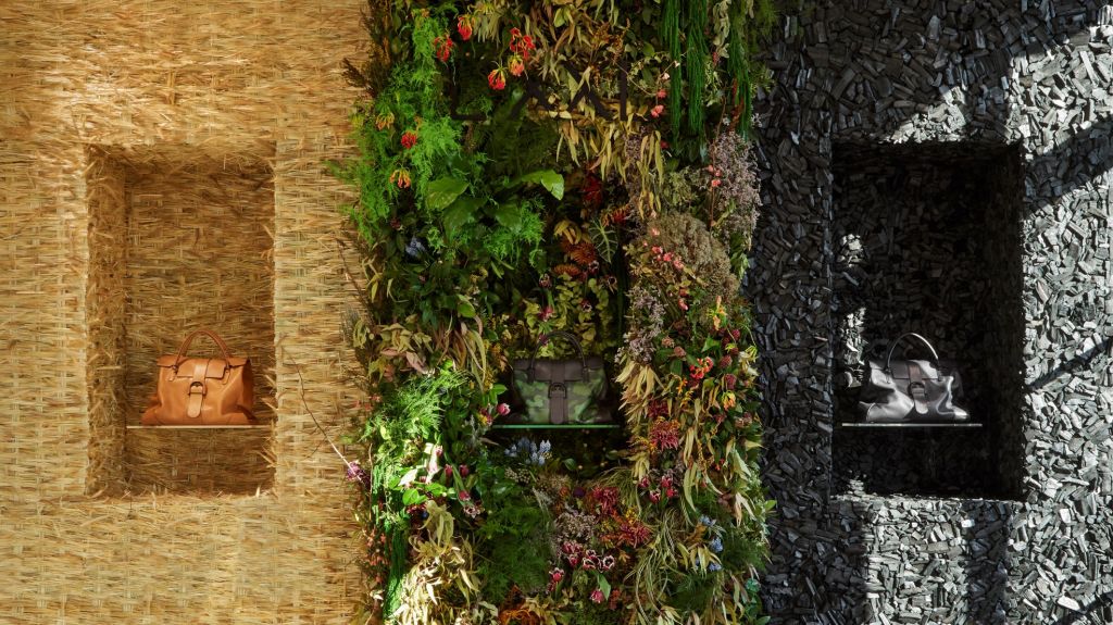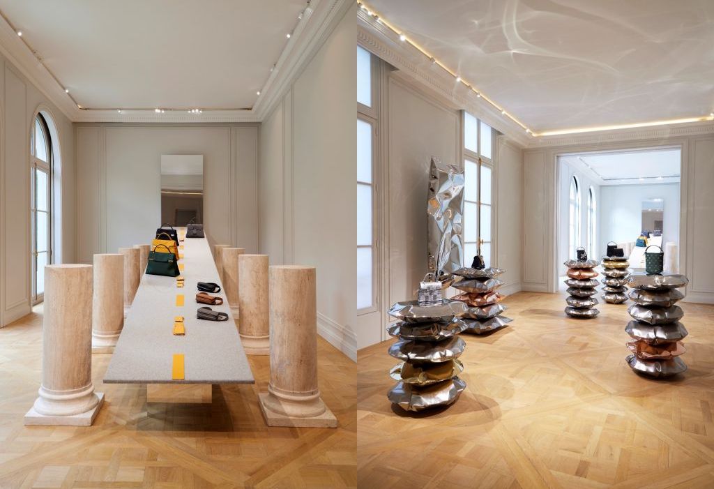 全新設計手袋陳列於大理石柱上,使毛呢材質樸實中更襯典雅。Jean Colonna設計Brillant L’XXL手袋以最柔軟、如雲朵般輕盈的皮革再度亮相,帶領我們在充滿舒緩自然元素的宇宙中小憩。