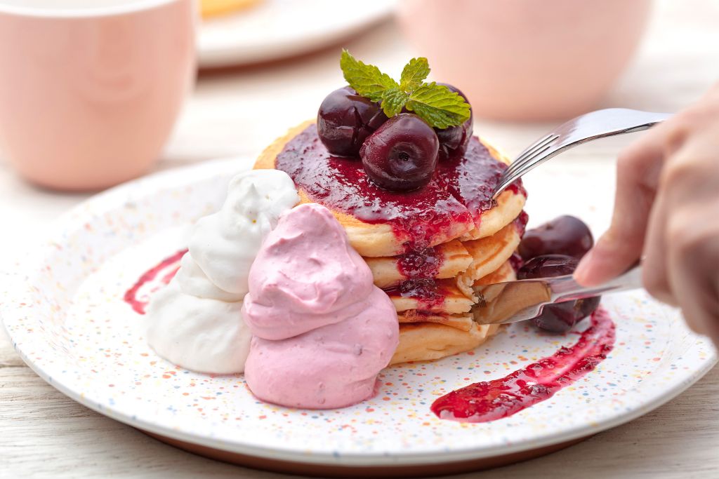杏桃鬆餅屋將酸櫻桃與檸檬等熬煮為酸櫻桃果醬,高貴奢華不失可愛風格的粉紫魅力,糖漬櫻桃與北海道鮮奶油融合的自然酸甜。帶有些許紅紫色的酸櫻桃果醬為Q彈的「櫻桃北海道鮮奶油 薄鬆餅」增添酸甜層次,一旁還有酸櫻桃果醬與北海道鮮奶油調製而成的天然粉紫色櫻桃鮮奶油,推薦給想品嚐濃郁櫻桃風味的櫻桃愛好者。