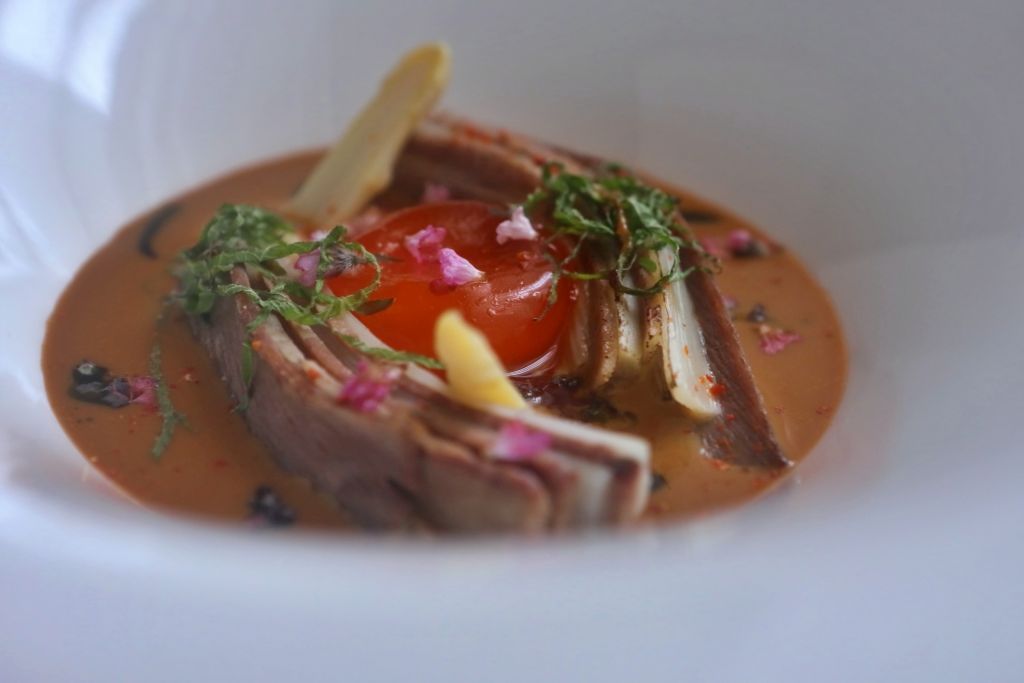 牛舌/白蘆筍/鴨蛋:炭烤牛舌將外皮烤出焦香氣,中心保持著柔嫩Q彈口感,火候掌握得宜,嚼在口中慢慢釋放豐美油脂,滋味彈牙令人上癮。搭配當季肥美、多汁、水嫩法國白蘆筍,炭烤的焦香牛舌與鮮美的白蘆筍清香絕對難以忘懷。