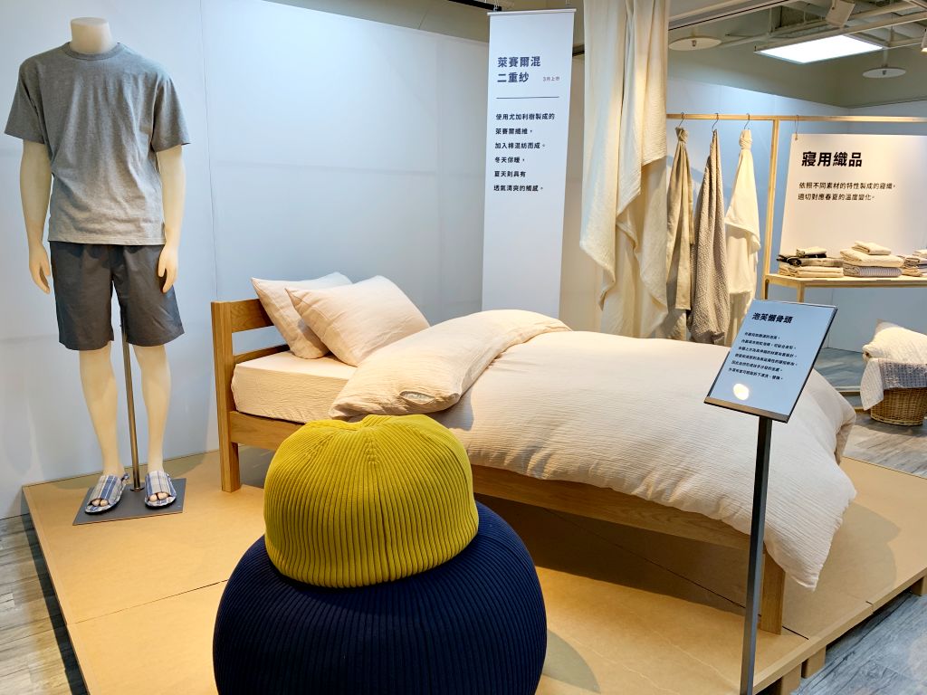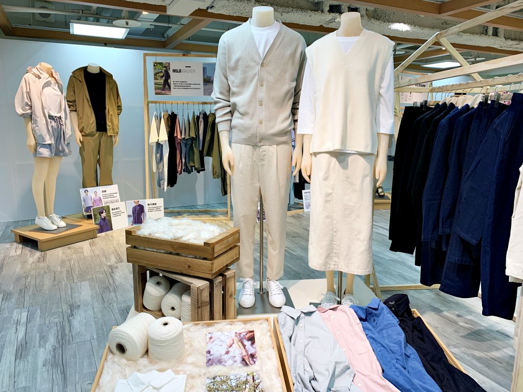 MUJI服裝採用全新面料,吉貝木棉、大麻纖維、再生聚酯纖維等,吉貝木棉的種植過程幾乎不使用農藥,且不用砍伐樹木、只需取得果實就能製作纖維,對環境非常友善,同時具有輕盈、吸濕、保暖的特性。