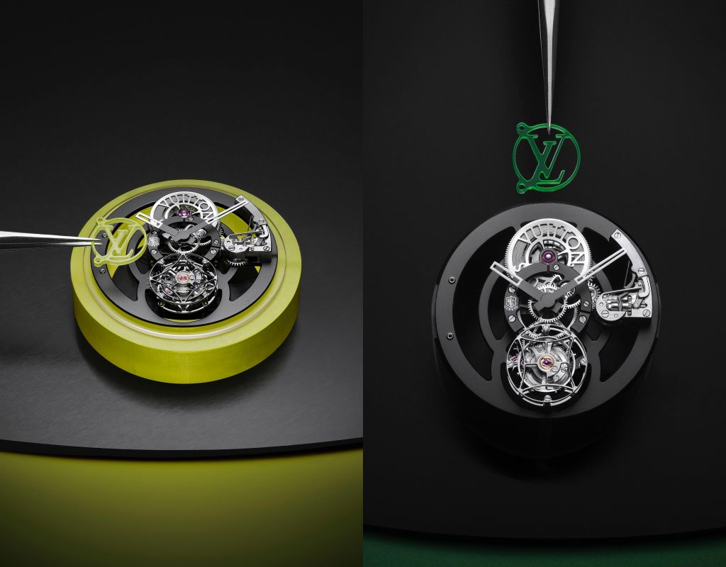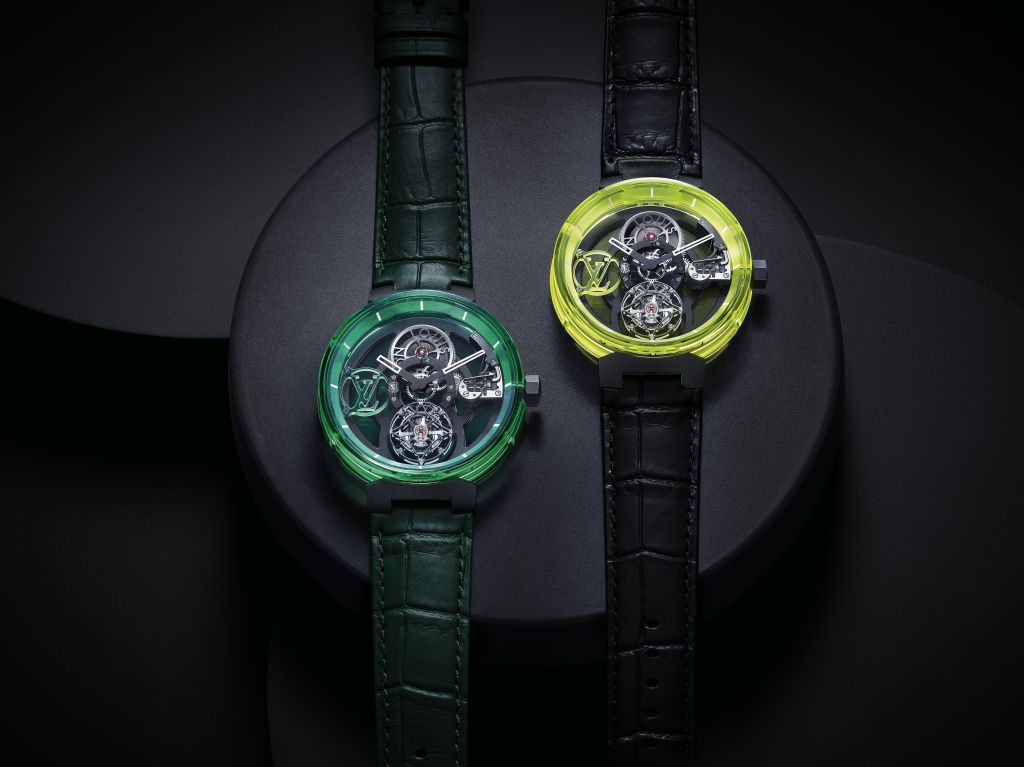 2款全新TAMBOUR MOON FLYING TOURBILLON POINCON DE GENEVE飛行陀飛輪「日內瓦印記」真實展現LV製錶工場的工藝與專業,為極透明的腕錶系列增添色彩。2023年這2款以整塊染色人造藍寶石雕成的腕錶,推出螢光綠或黃色錶殼。