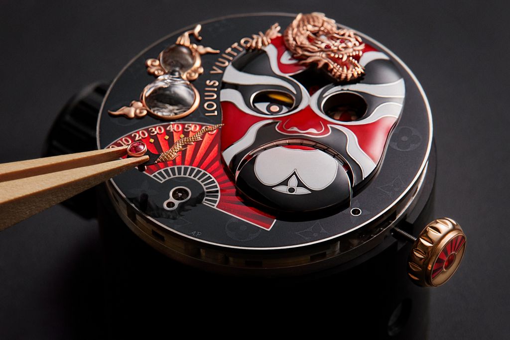 為了將這種神祕古老變臉藝術的相互作用概念移轉到錶殼設計,LV製錶工場米歇爾納華斯Michel Navas與安利可巴巴西尼Enrico Barbasini兩位製錶大師鼎力相助,創造了這款傑出的手錶機芯,琺瑯大師安妮塔波謝Anita Porchet與雕刻大師迪克史汀曼Dick Steenman則以精湛設計裝飾這款腕錶。