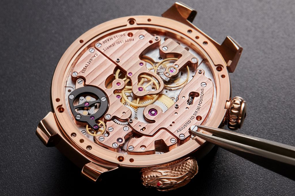 錶殼背部需要50小時機械加工,及60小時手工與機械精加工,才能變得完全透明,再準備組裝。有路威標誌的透明錶橋,需要20小時切割與40小時手工精加工,才能完美無瑕地透光。