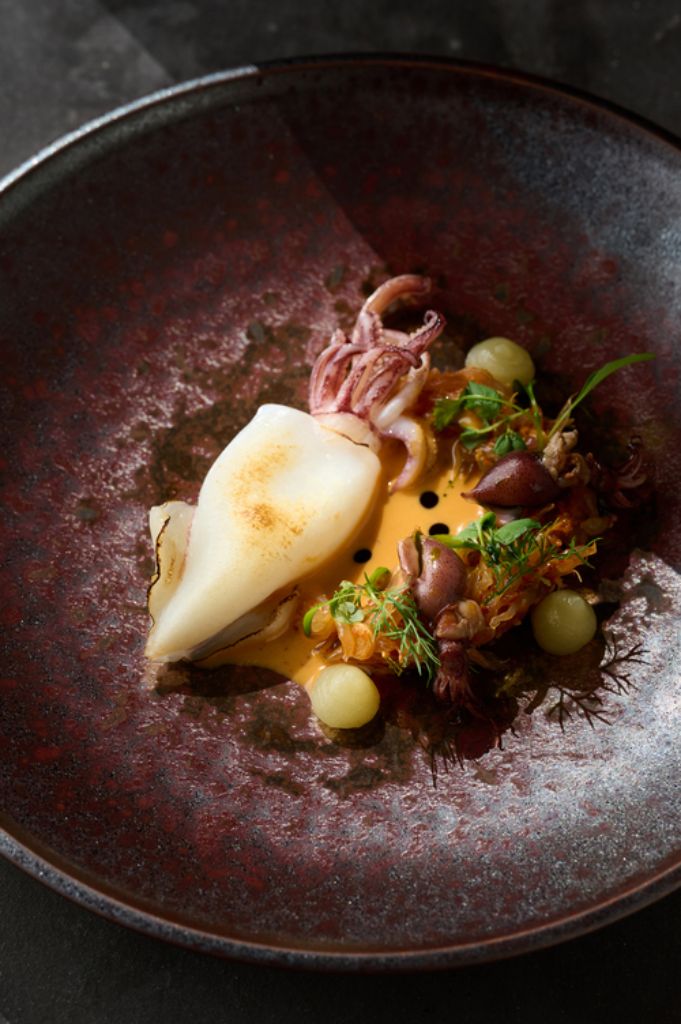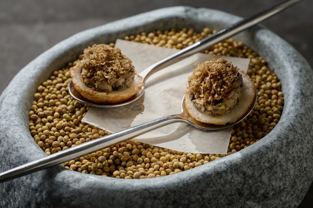 通常搭配薄荷、香菜與糯米飯一起品嘗,主廚利用北海道生干貝取代肉類,以熱炒糯米粉詮釋米飯香,搭配泰式沙拉,佐以黃甜椒海鮮醬汁,最後淋上辣椒油與香菜油,入口細緻優雅,明亮的酸度與甜辣風味更顯爽口。