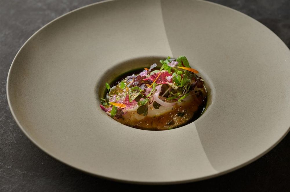 開胃小點「青魽/棕櫚糖/花生」靈感源自泰國宮廷小點,將塔皮底部填入風味清爽的椰肉、花生碎粒及夏香薄荷,上層利用韃靼料理方式,將生青魽丁均勻拌入棕櫚糖及魚露醬汁,一口就能享受酸、甜、鹹、鮮的多重滋味。