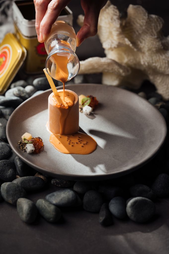 主廚將傳統泰式奶茶解構,取白巧克力、椰奶、雞蛋、煉乳與鮮奶油,加入泰國手標紅茶拌勻後作成泰奶冰杯,傳統融合經典,上桌時再由賓客手動倒入西谷米與泰式奶茶,讓更多饕客享受邊吃、邊喝、邊玩的樂趣。