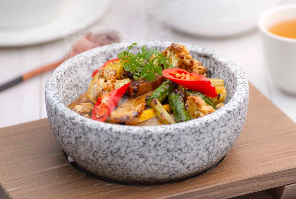 漢來蔬食特別運用川菜料理技法,祭出「椒香干鍋彩蔬」滿足饕客的五臟廟,主廚以特調辣醬拌炒白花菜、櫛瓜、筊白筍等多種鮮蔬,加入神似滷爌肉的「五花蒟蒻排」增添豐富口感,干鍋手法將醬汁的鹹香完整收進配料裡,香辣入味非常下飯。