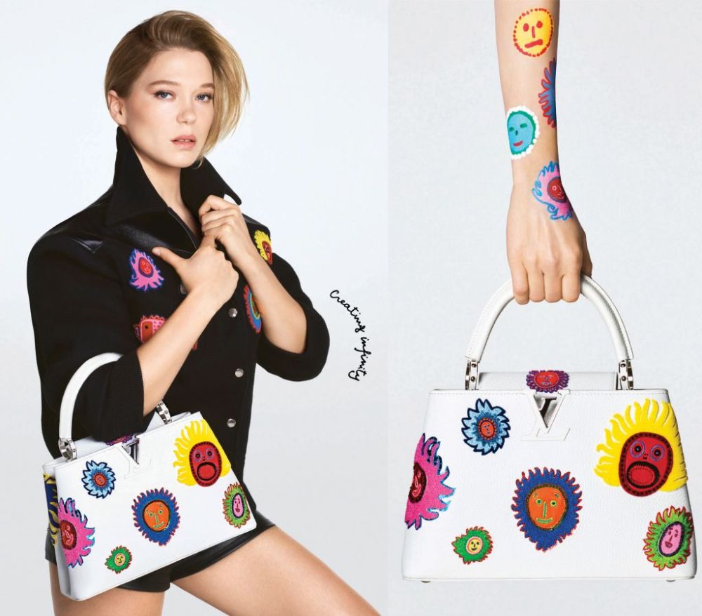 在DROP 2廣告中,運用新的圖案表現草間彌生充滿無窮表現力的快樂精神。光芒四射的南瓜、五顏六色的臉孔、花朵、無盡的圓點與無盡的網,出現在路易威登代表的Capucines與Monogram手袋與配飾。