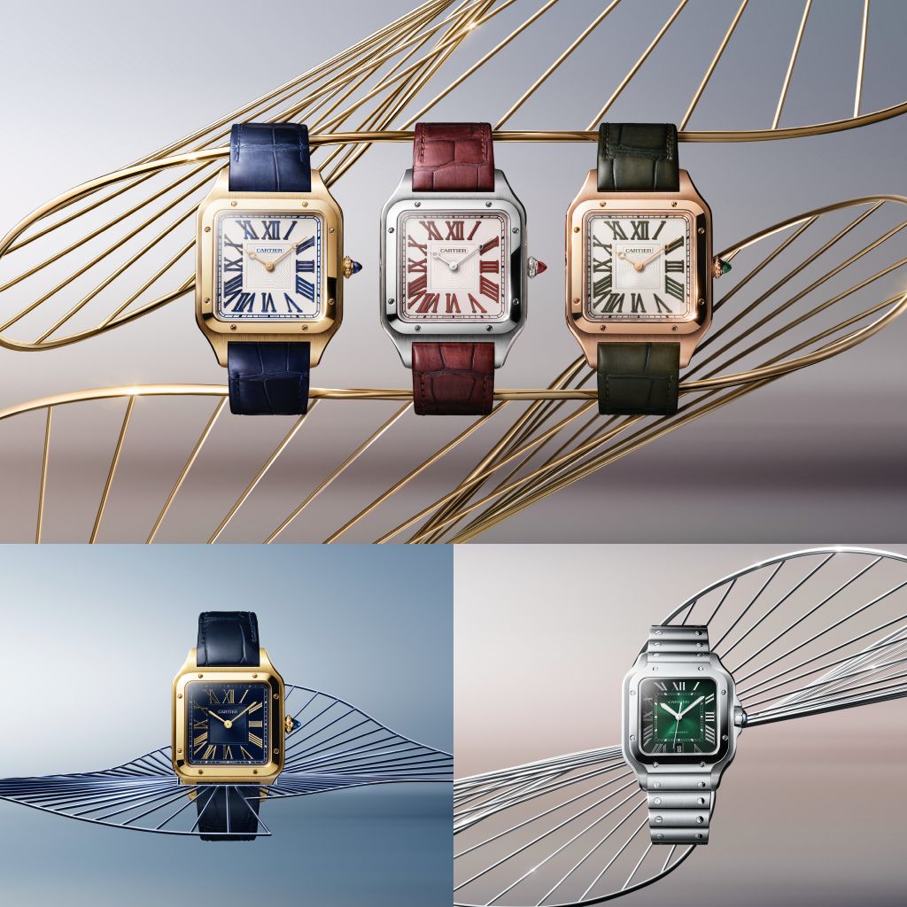 SANTOS-DUMONT為首款帶上手的腕錶,採用金質或精鋼錶殼、螺絲裝飾、圓珠形上鍊錶冠與凸圓形藍色寶石,今年系列新作腕錶用色更大膽,中型款與大型款分別配了深綠與深藍漸變色,鏤空腕錶搭配全新9629MC型自動上鍊鏤空機芯,212枚零件在藍寶石水晶面下一覽無遺。