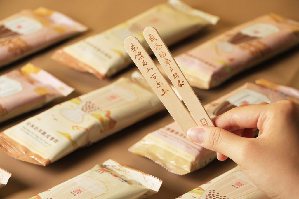 兩款雪糕特別設計印製墨寶文青冰棒棍,將每間春水堂都有的書法作品「鼎湯初沸有朋來、茶館為人間樂土」,搭配珍珠奶茶與蓋杯圖樣,印製在冰棒棍上,文青感十足。