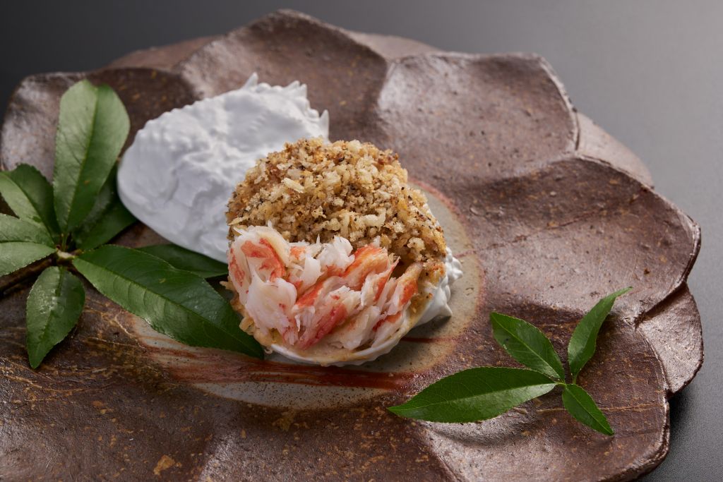 薰風 甲羅燒:蟹肉甲羅燒在日本屬於高級宴會菜,以蟹殼為器皿並盛滿蟹肉漿,蒸烤後撒上葡萄乾麵包糠,增加酥脆口感及香氣,入口後細緻奶香瀰漫味蕾,搭配特製沾醬,酸甜層次就像漫步在夏日溪邊的谷關。