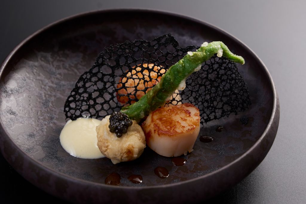 越境 塩燒帆立貝 玉子慕斯 魚子醬:越境字面意為跨越國境,運用法式調理手法及擺盤方式,呈現谷關夜晚風清月朗的意象。綿密的玉子慕斯代表雨後山嵐,竹炭製成的蕾絲餅象徵綿延的山巒,深色器皿襯托干貝的金黃酥脆,宛如皎潔明月,最後以在地鱘龍魚魚子醬點綴,讓整體達到視覺及味覺雙重享受。