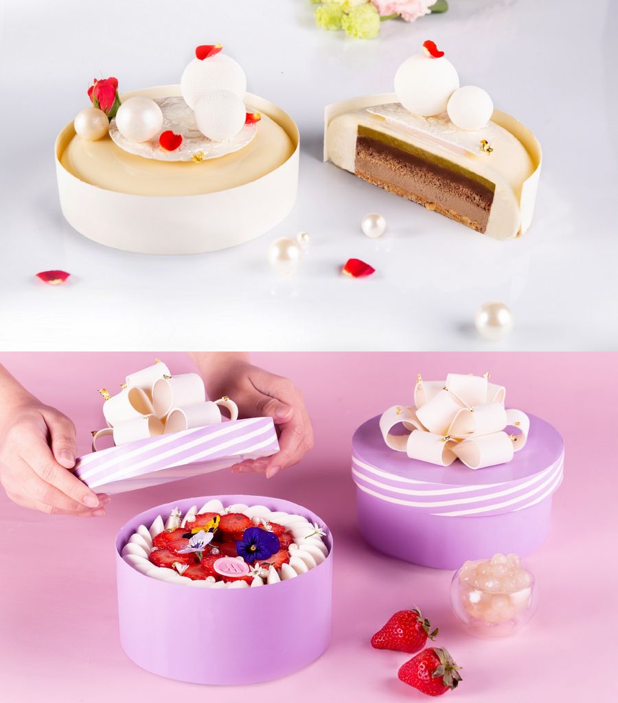 「濃芋馨情」鮮奶油蛋糕絕美視覺系造型,使用法芙娜白巧克力打造粉嫩芋香紫禮物盒,製造掀開禮物盒的驚喜感,搭配精心設計擬真緞帶十分吸睛。