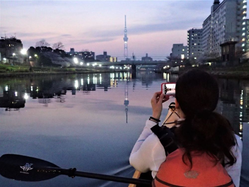 行程前半段正值日落時刻,可觀賞由黃橙蛻變為紅紫的晚霞百變美景;後半段能欣賞點燈後東京都會的絢麗夜景。若巧遇無風日,街景會完美倒映於水面上,在划槳之際能感受宛如漂浮於夜空中的特別體驗。