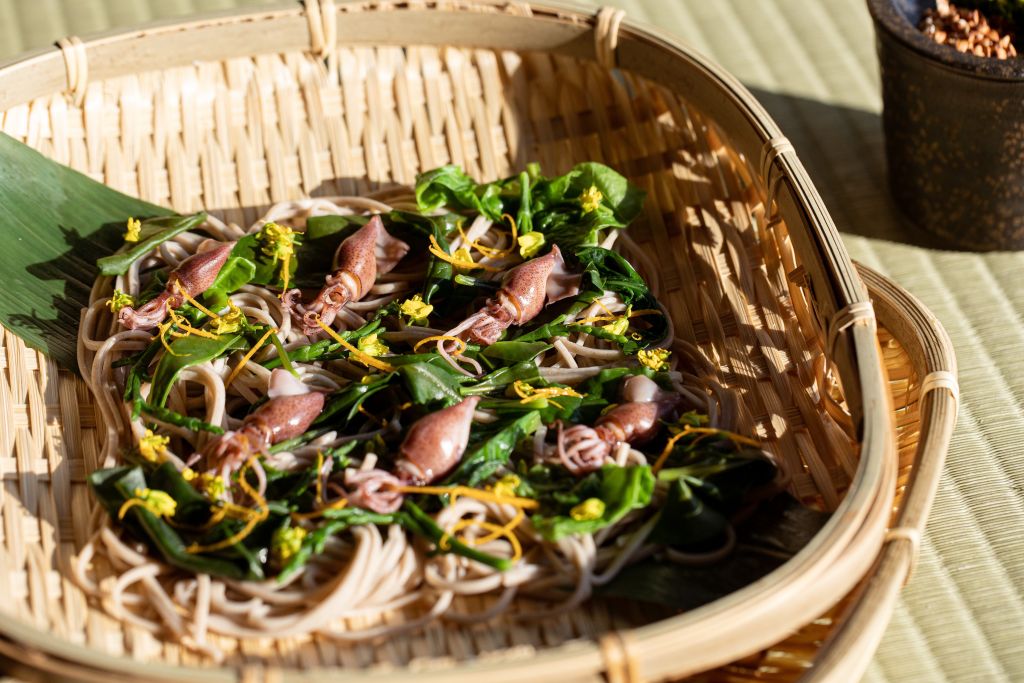 色彩繽紛像油畫一般的蕎麥麵,上面鋪著深綠色微苦的人蔘葉、切成極薄極細的橙絲鋪滿日本富山灣的螢烏賊,沾著醬汁吸入的蕎麥麵好像是把春天的氣息都保留了下來。