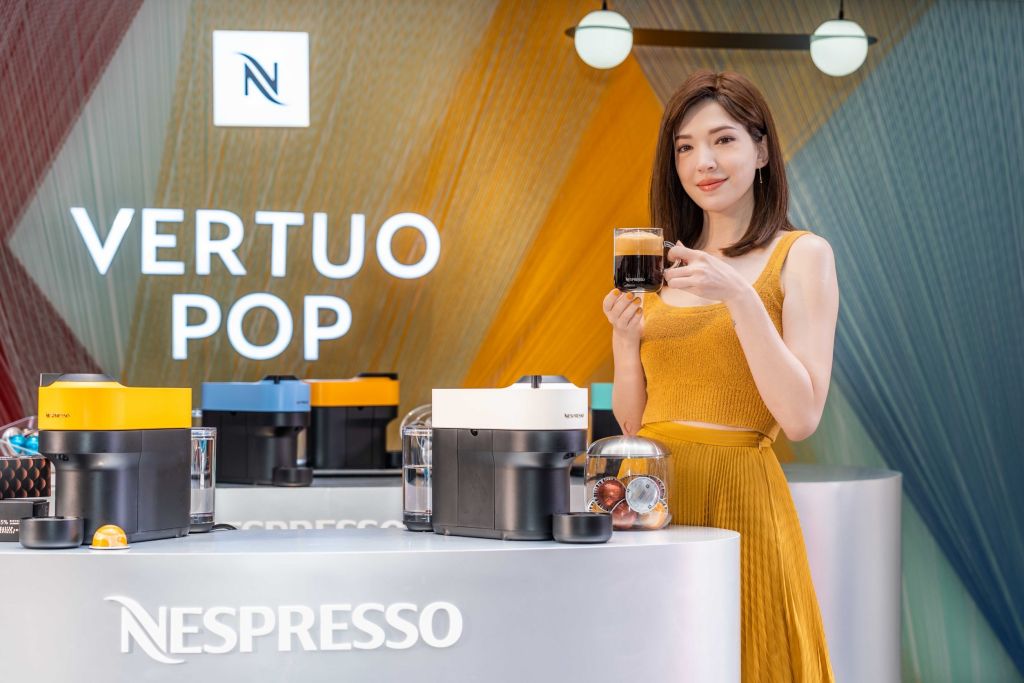 NESPRESSO永續大使許瑋甯在快閃店現場體驗媲美專業咖啡師的全新機型,品味擁有厚達2.5公分咖啡油沫(crema)的臻選厚萃咖啡,大方分享VERTUO POP咖啡機的美好生活哲學啟發,不盲從潮流,才能活出屬於自己的樣貌。
