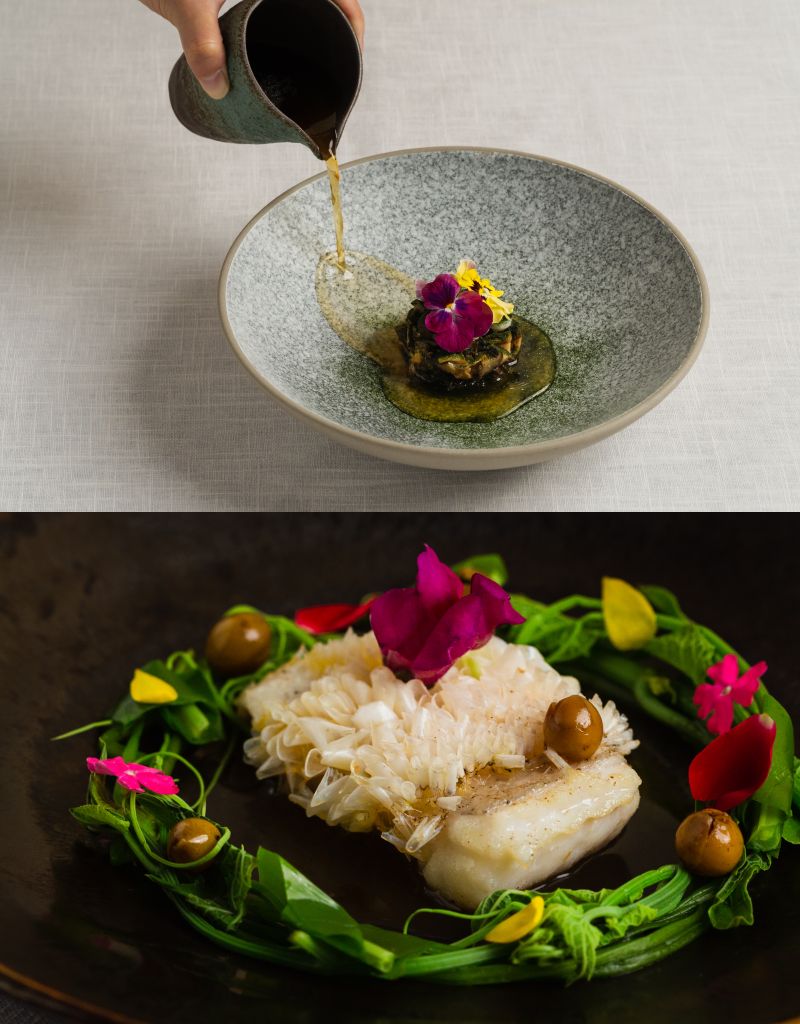 蛤蠣.鯊魚煙.山葵翻轉台菜概念,將鯊魚煙、蛤蠣及白酒爆香後製成泡泡泥,溫泉空心菜增加脆口感,中間滴入草本油增添風味,搭配肉質飽滿鮮甜蛤蠣,濃郁鮮味在口腔中流竄,亦可隨意搭配富獨特芥末風味但不嗆辣的山葵芥苗。