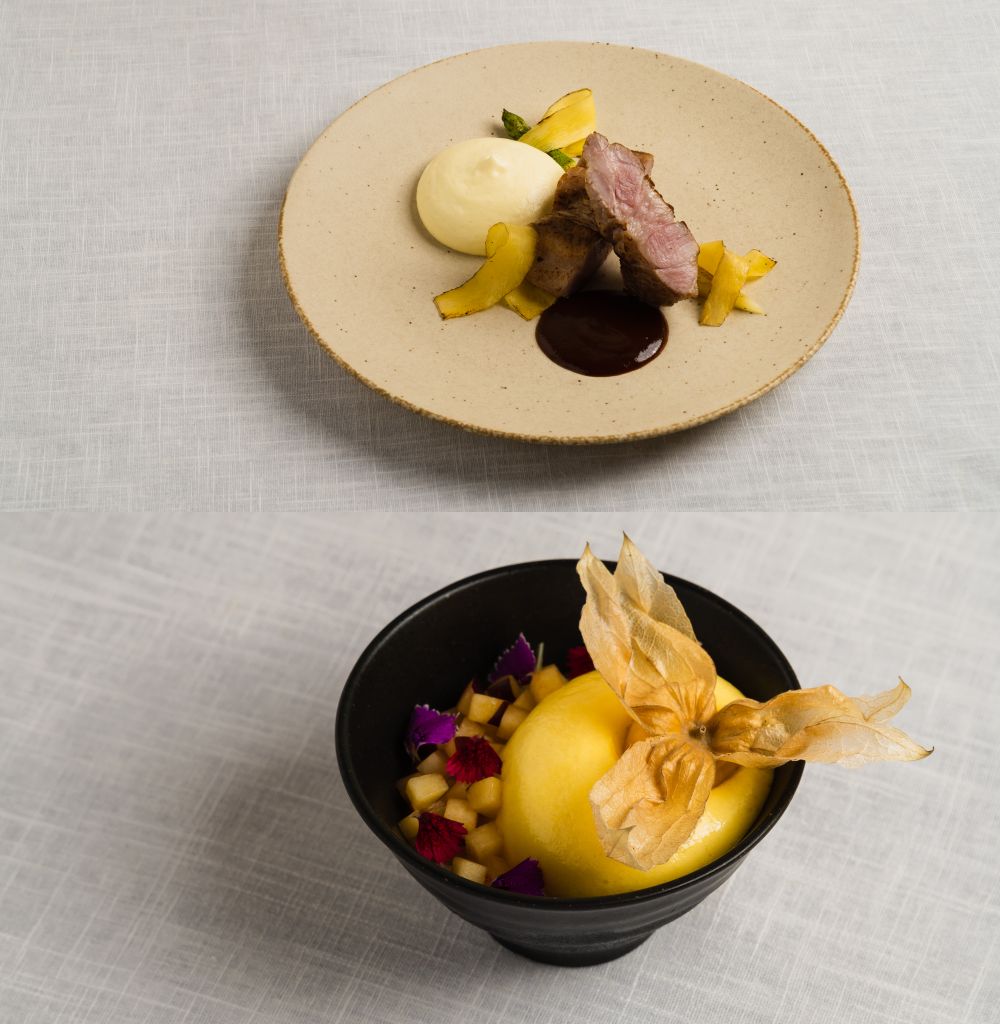 盤克夏黑豬.蘆筍.鳳梨心選用台灣飼養盤克夏黑豬梅花,以直火燒烤呈現肉質軟嫩肉汁香甜,佐以主廚特製燒烤醬,鳳梨取中心利用果醋熬煮,切成薄片並煙燻,簡單炙燒後釋放更多甜味,搭配特選57號地瓜泡泡,充滿濃郁奶香及地瓜香甜。