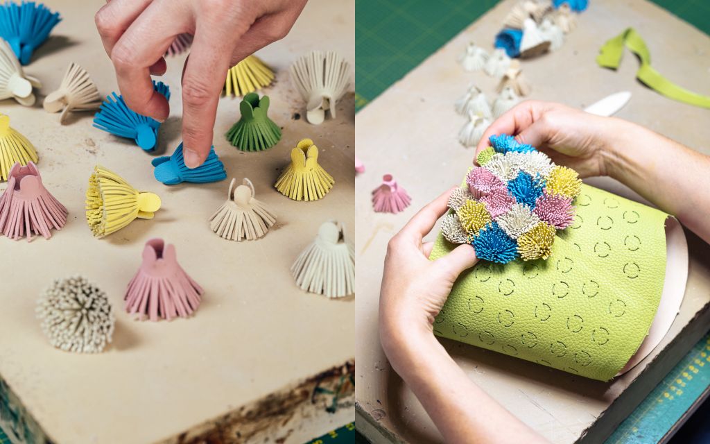 POMPONS設計盡顯奇思妙想,純熟工藝不可或缺。每朵絨球均由Supple Calf小牛皮裁出細密流蘇,而後手工捲紮點綴至手袋外部,如片片花瓣堆疊而出的悅目花束。每只Pin Mini Bucket POMPONS手袋需耗費至少7小時手工點綴絨球。