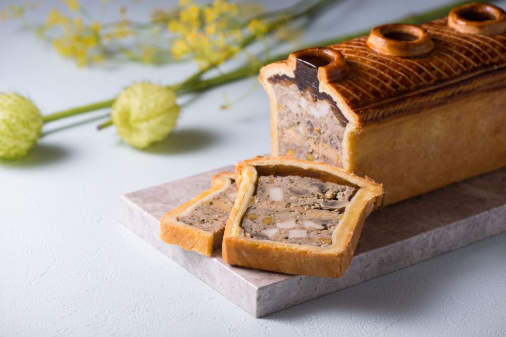 經典必吃法式道地傳統代表手工菜「皇家肉凍派/竹地雞/鴨肝」,以數十種特製香料醃製台灣竹地雞並加入開心果、蘑菇及鴨肝,高湯凍以干邑白蘭地與澄清雞湯熬煮而成,口感甘甜細緻卻不失緊實。