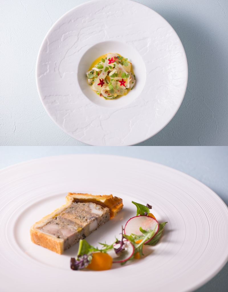 入口可感受鴨肝的軟嫩、雞肉的甘甜細緻與外皮的酥香鬆軟,佐搭的春季沙拉選用燈籠果、醃漬大根、黑醋栗果醬與時令蔬菜,以竹地雞熬煮的雞汁搭配雞油為醬汁。每口層次分明、獨特風味令人難忘。