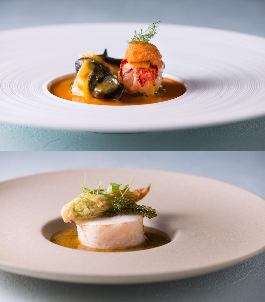 「藍龍蝦/赤海膽/海鮮醬汁」善用整隻珍貴藍龍蝦的頭與身體部位與日本赤海膽結合,搭配法國經典馬賽魚湯基底做醬汁的奢華海味。湯汁口感濃郁醇厚、肉質鮮嫩彈牙,這道極品奢華海味,濃郁甘醇令人允指回味。