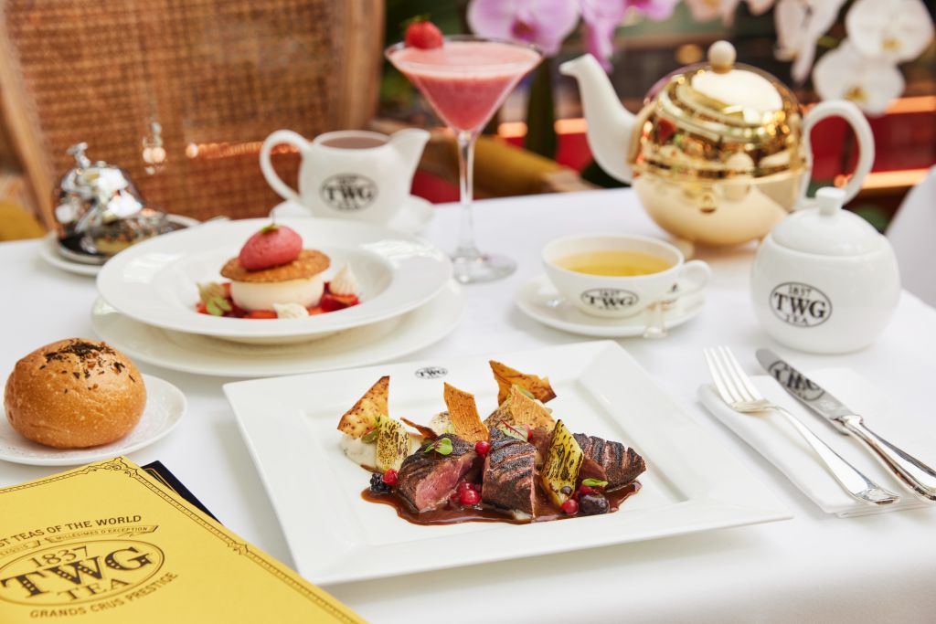 套餐甜點是香甜綿密的法式香草杏仁帕菲草莓雪酪,搭配TWG TEA銀月綠茶為基底精粹出的草莓冷湯,絕妙口感與滋味在口中融合,沉醉在以茗茶為主題的甜蜜氛圍中,在悠揚典雅的古典樂聲中創造珍貴回憶。