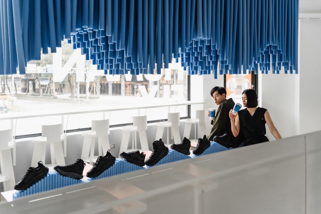 BOUNC!NG ZONE分為兩大體驗區,在1F天井區中與不倒翁式充氣柱緊密相連,具象化感受HOKA鞋底回彈時緩震作用。2F展示HOKA雙系列鞋款,GLIIDE系列巧妙垂吊客席區,可近距觀看HOKA跑鞋設計細節。SKY HIKE系列登山鞋款陳列中島座位,運用緩震泡棉構建呈現上下陡坡。