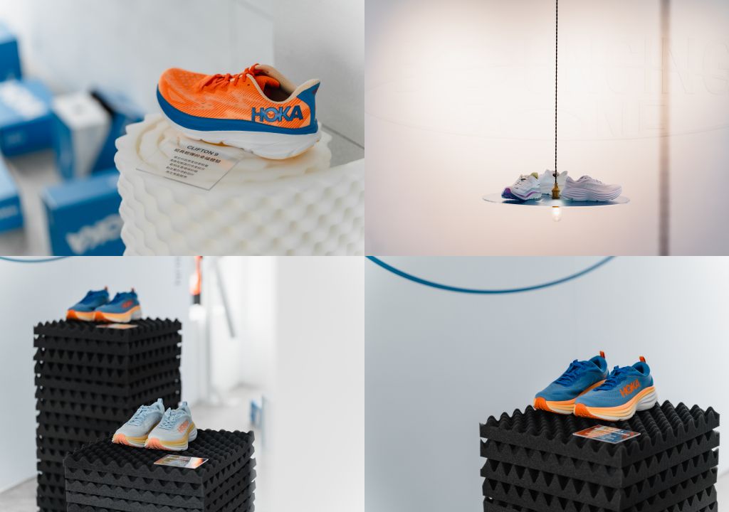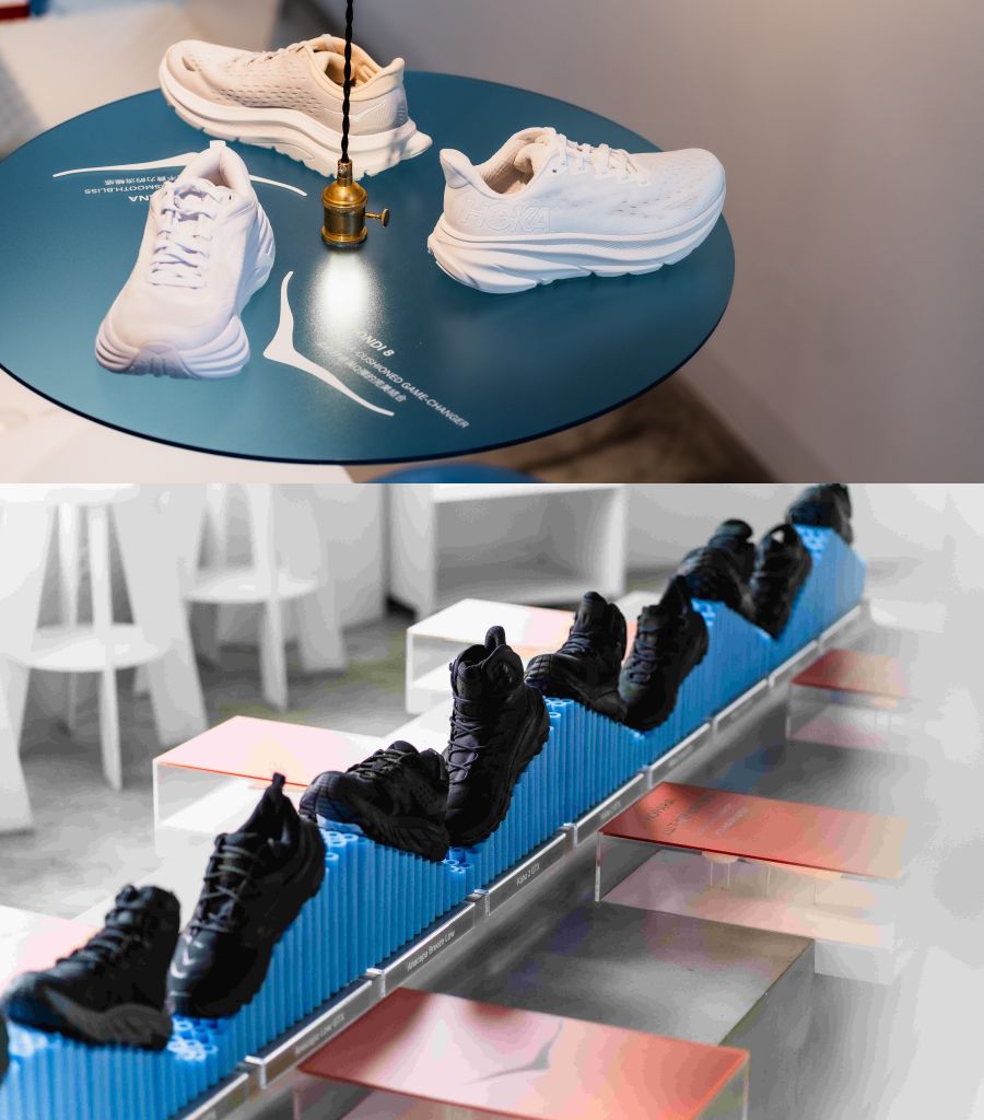 CAFE!N|HOKA合作計畫以「BOUNC!NG ZONE」為題,概念店展示了HOKA經典SKY HIKE山系鞋款與GLIDE跑鞋款,以策展思維貫穿視覺與空間,模糊展示與餐飲空間界線,將HOKA鞋底回彈感受視覺具象化、BOUNCING體感體驗植入咖啡空間。
