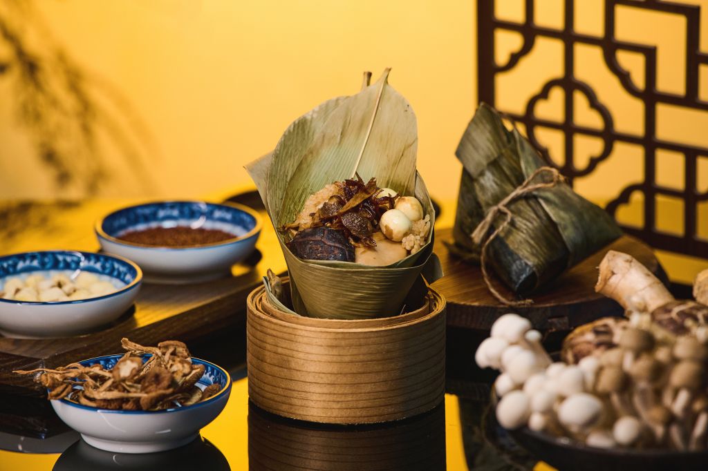 金腿乾鮑裹蒸粽以鮑魚汁為糯米調味,加入鮑粒、原隻30頭中東乾鮑、瑤柱及雲南火腿等上乘餡料,滿載豐腴滋味,份外矜貴。瑤柱裹蒸粽香糯軟綿的糯米包裹著玫瑰露醃製的匈牙利豬肉,甘香味美,是不可或缺的經典味道。