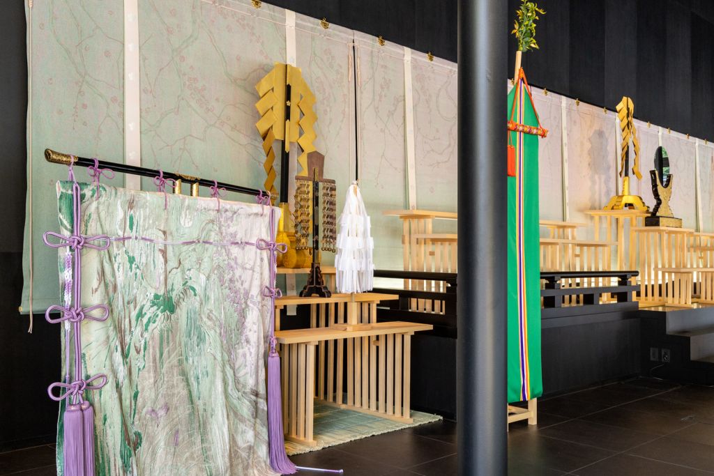 為將文化藝術之神(菅原道真)的精神傳承至現代,連結到未來,在建造臨時本殿時,邀請了令和時代具代表性創作家們齊聚一堂,建築師藤本壯介擔任”臨時本殿”的設計、規劃與建造,分隔天神大人住所與參拜場用的”御帳”與”几帳”,則由時裝設計師黑河內真衣子Mame Kurogouchi操刀。