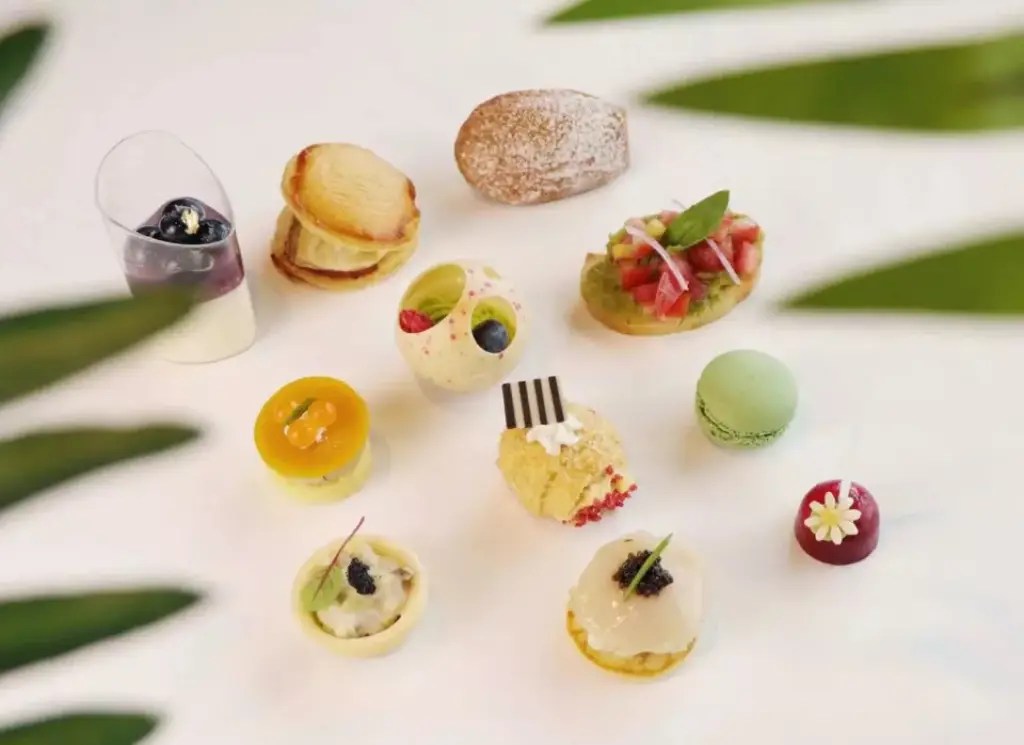 鹹食包含結合大西洋海味鮮美與加州柑橘酸甜的「龍蝦佐柳橙凍」、向經典米食加州卷致敬的「燻鮭魚洋芋捲」,及象徵隨興自在加州精神的「爐烤火腿佐鵪鶉蛋」。