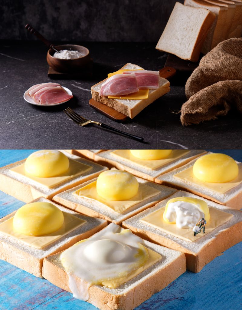金華火腿生吐司厚片靈感來自湘菜名菜富貴雙方,選用萬有全的蜜汁金華火腿搭配香濃高融點起司片,並在蜜汁火腿多刷一層糖霜增加風味,甜鹹交織的風味,令人拍案叫絕。
