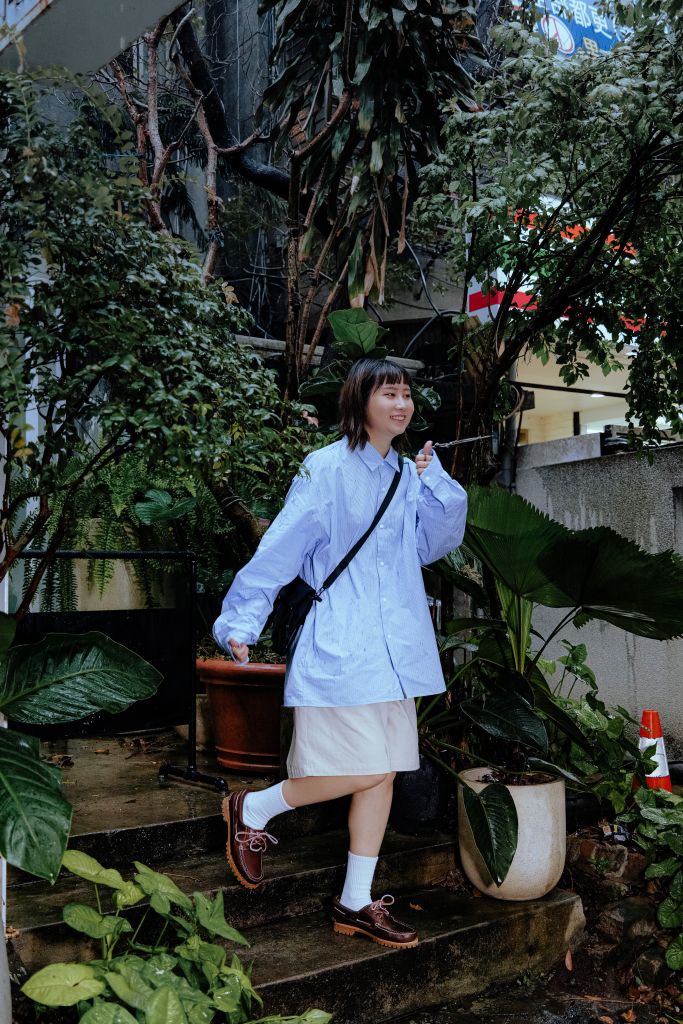 店員芳瑜穿著條紋襯衫搭配自製女裝短褲,利用清爽色系與簡潔單品,以帆船鞋呈現乾淨利落街頭感。她認為經典是受得起時間考驗,且歷經多年仍保有相同價值及搭配性,就像對帆船鞋的第一印象,能在每個世代裡佔有一席之地,並為不同世代穿著者賦予自己的性格。