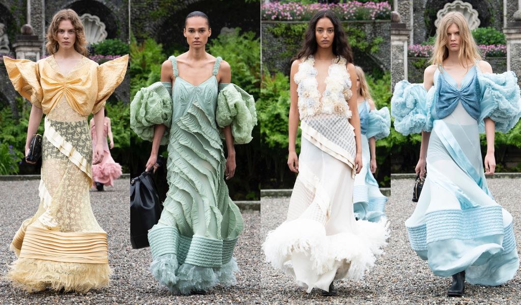 柔和粉彩色系的拉絲羊絨毛衣,刺繡蕾絲、奢華錦緞與牛仔褲、亮片花卉連衣裙,及經典剪裁外套等適合日常裝扮。禮服設計混合絲綢、歐根紗與蕾絲,柔軟的披肩、沙發袖、雕塑搖擺般裙擺,建築廓形的雪紡長禮服搭配貝殼般手拿皮包,展現多款禮服精緻又大膽的設計。
