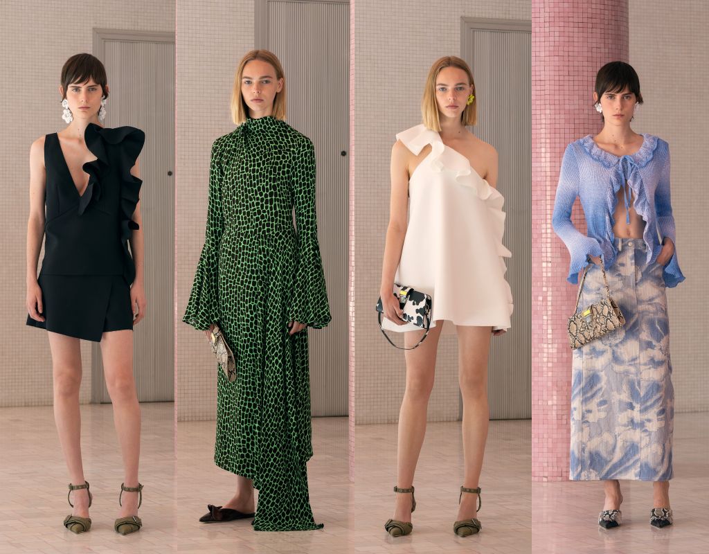 本系列蓬蓬裙塔夫綢蝴蝶結、條紋西裝半蝴蝶結、雙層縐紗洋裝荷葉邊等許多MSGM元素以更高級形式呈現。針織衣物的漸層處理彷彿結染工藝的新型精緻演繹。這些服裝聯想到夏季天空中黃金時刻,展現系列的詩意魅力。