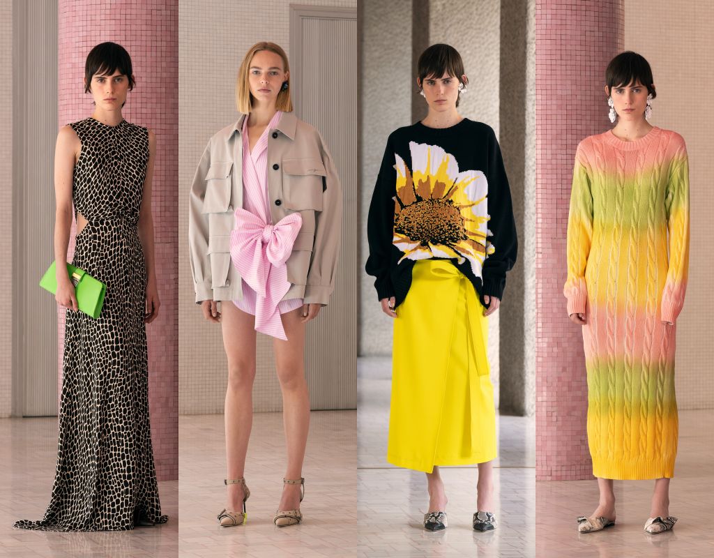 棉帆布大型提花圖案中,花卉圖案超越形象界限,展現迷人的抽象效果;野獸圖案注入優雅的圖形風格:天鵝絨以大膽奶牛印花煥發生機,在棉帆布以滴水般呈現達到巔峰,精緻的緞面洋裝點綴著長頸鹿圖案。