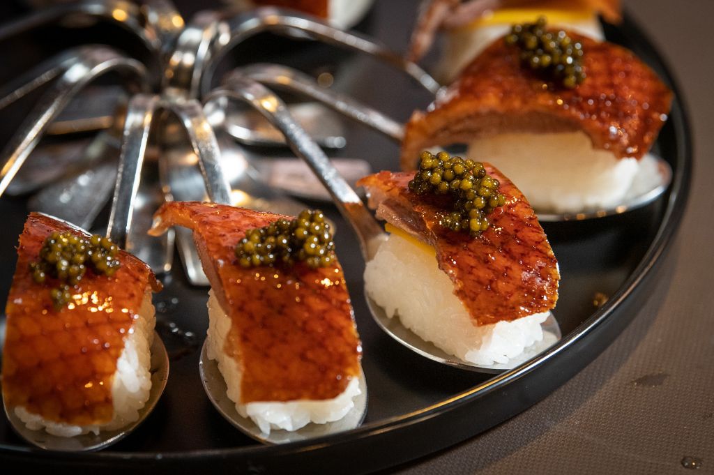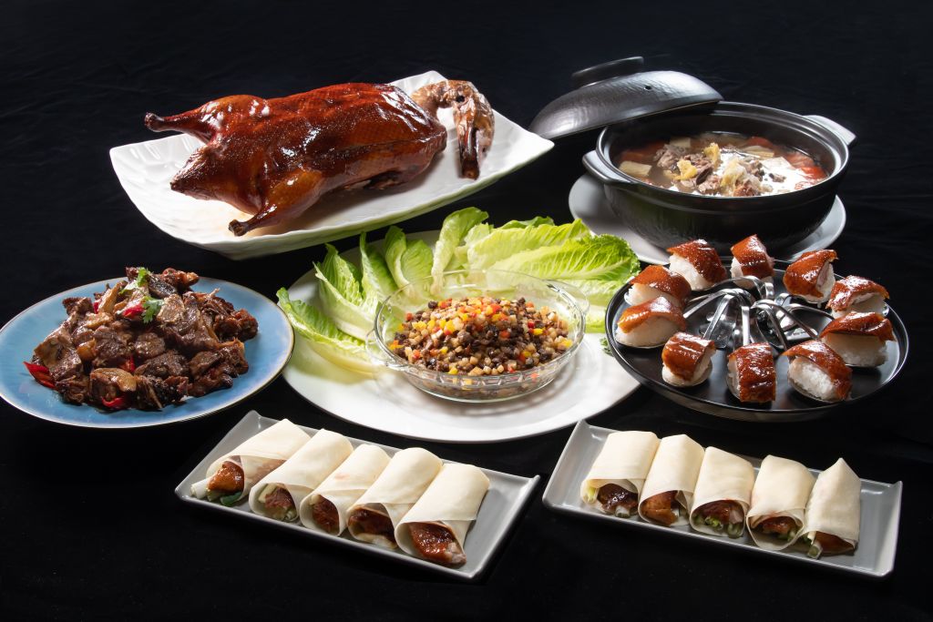 最具特色的「烤鴨五吃」,特選3.5公斤重宜蘭櫻桃鴨,以獨家配方醃製後窯烤,最後再淋熱油增加外皮脆度。行政主廚鍾易庭強調:「我們的片皮鴨是連片帶肉手法,吃起來口感更豐富。」烤鴨五吃分為片皮鴨捲、櫻桃鴨握壽司、三杯杏菇炒鴨骨、蘿蔓松子炒鴨鬆與酸白菜鴨架煲。