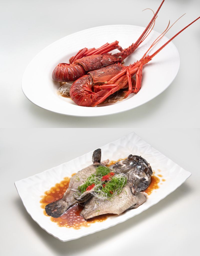 「招牌水姑娘龍蝦」與「蔥爆鮮露龍虎斑」是從2樓現流鮮市直撈直送廚房烹調,澳洲水姑娘龍蝦富豐富濃郁的蝦膏,龍蝦肉質脆彈,本身帶特殊香氣。龍虎斑同時擁有龍膽石斑Q彈富膠質的魚皮,又有老虎斑魚肉的細緻,吃起來更具大海鮮味。